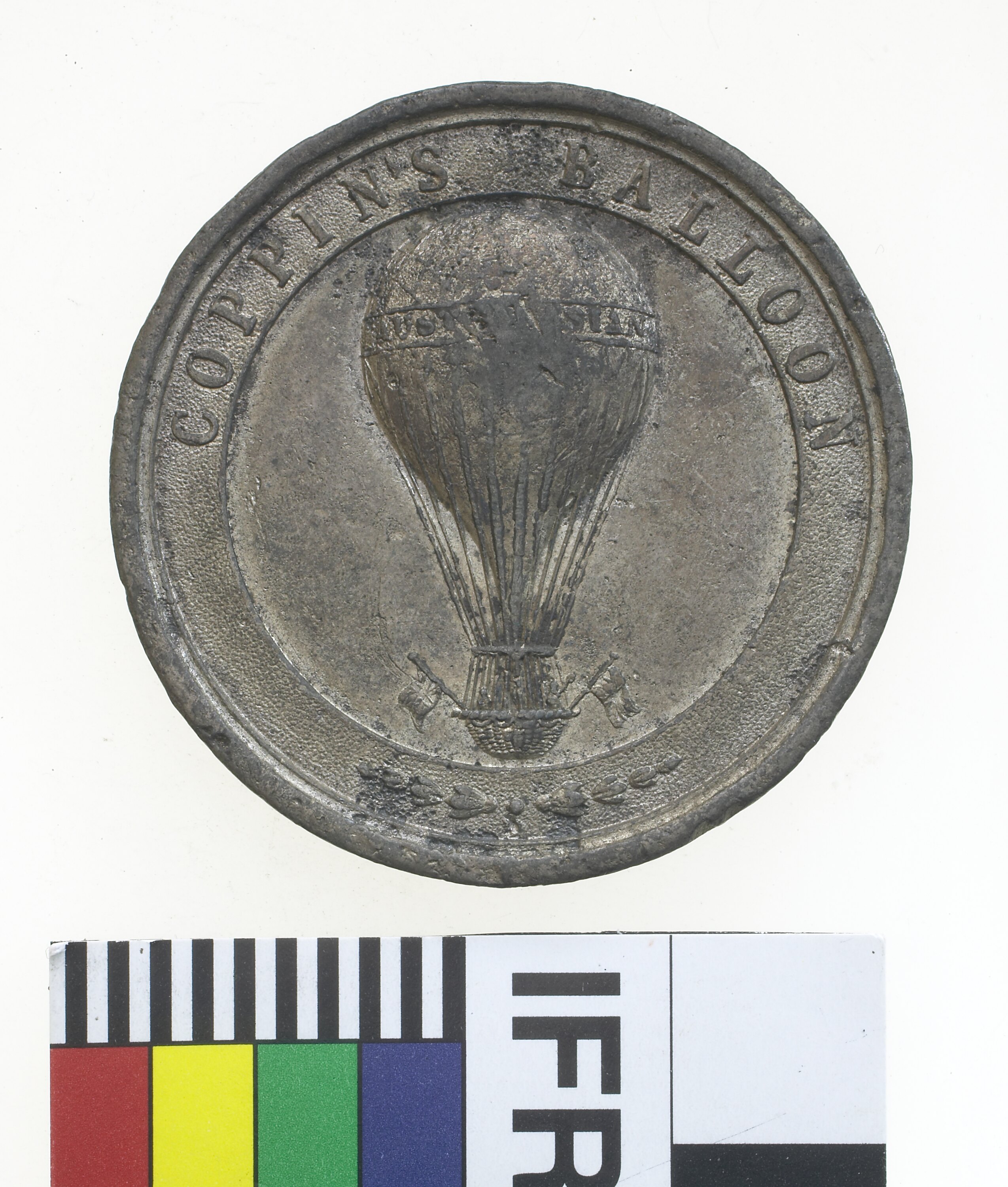 A white metal medal (38 mm diameter) featuring Coppin's Balloon in flight with two people.