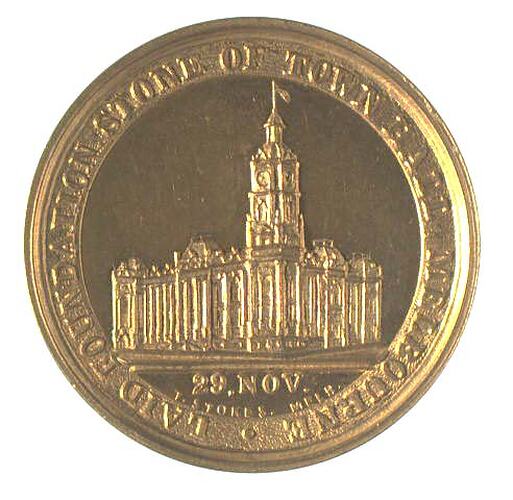 View of Town Hall; around, LAID FOUNDATION STONE OF THE TOWN HALL, MELBOURNE; in exergue, 29 NOV; in tiny letters, T.STOKES MELB.
