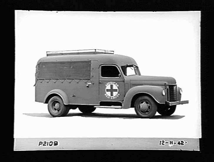 Side view of an International K series motor ambulance for the American Red Cross in Australia.
