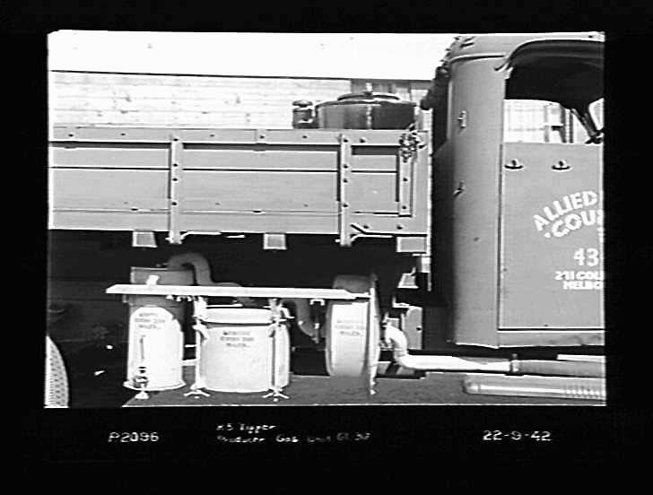 Side view of the cooling and cleaner units for a GL-300 gas producer unit fitted to an International K5 motor truck with a tipper body during the World War II. This truck was used by the Allied Works Council, a federal government civilian body responsible for carrying out construction projects on behalf of the allied military forces in Australia.