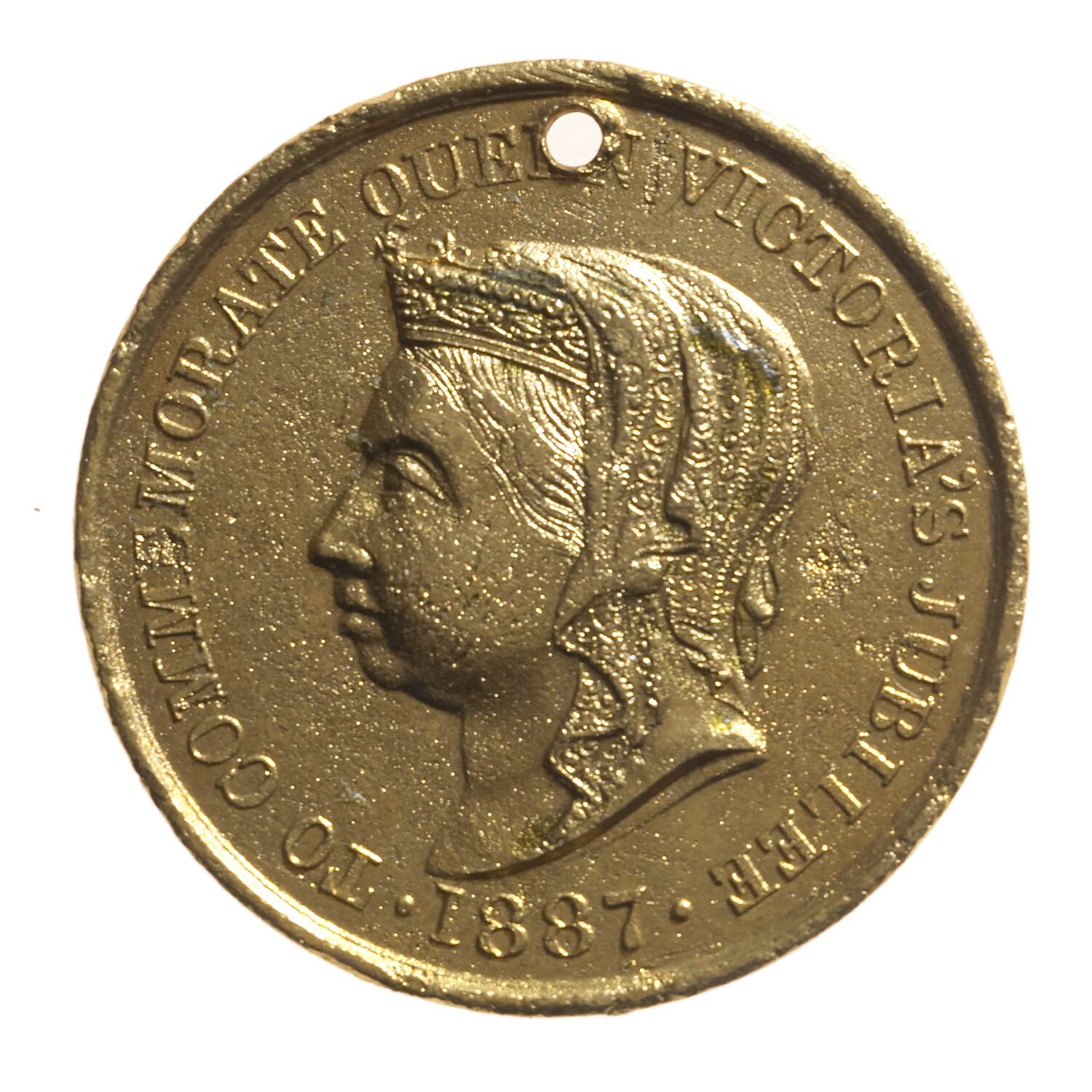 Head of Queen Victoria veiled left; around, TO COMMEMORATE QUE[E]N VICTORIA'S JUBILEE . 1887 .