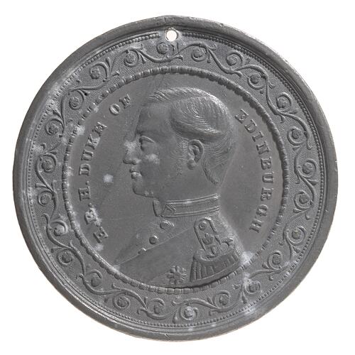 Other Details: Alfred, Duke of Edinburgh, Queen Victoria's second son, was Australia's first royal visitor. Arriving in 1867, he stayed for six months. This medal was the first of four versions issued. It features HMS Galatea, a ship driven by both steam and sail. During his visit to Sydney there was an attempted assassination of the Duke, who received a bullet wound to the back.