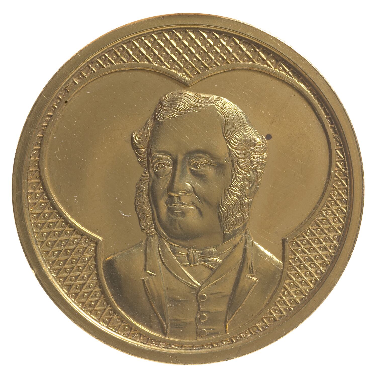 At centre within ornate three-ringed rim, bust of Edward Henty three-quarters left wearing suit and bow-tie
