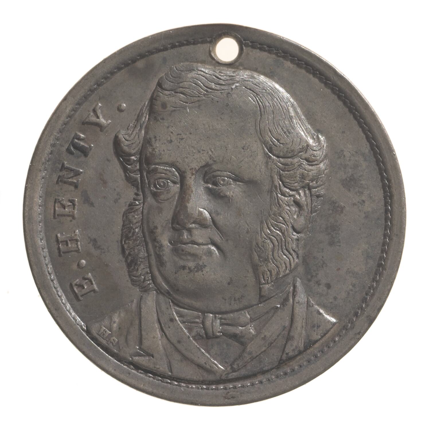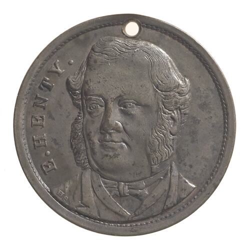 Medal issued to commemorate the 50th anniversary of Edward Henty's arrival in Portland, Victoria. Edward Henty was born in England in 1809 and migrated to Australia, as did his parents and brothers, in 1829. On 19 November 1834 he sailed from Launceston in the Hentys' own schooner, the Thistle, with stock and a small party. His brother Francis followed the next month with a small flock of merino sheep, the first in Victoria. The Henty brothers began whaling at Portland Bay and took their flocks and herds inland to the rich area on the Wannon River. In the 1840s they were eventually granted pre-emptive rights over most of their lands. Henty was known as a capable and energetic man and regarded as the chief actor in the early history of Portland Bay. He and his wife Anne Marie Gallie moved to Muntham, a 60,000-acre property that became widely known for its merino sheep and Durham cattle. It was also known for its extravagent hospitality - to which Henty's social ambition and vanity contributed considerably. This extravagence and Henty's obstinacy eventually led to the degredation of the flocks. Henty lived in Portland and in his Melbourne mansion, Offington, while he served as a member of the Victoria Legislative Assembly. He died on 14 August 1878.