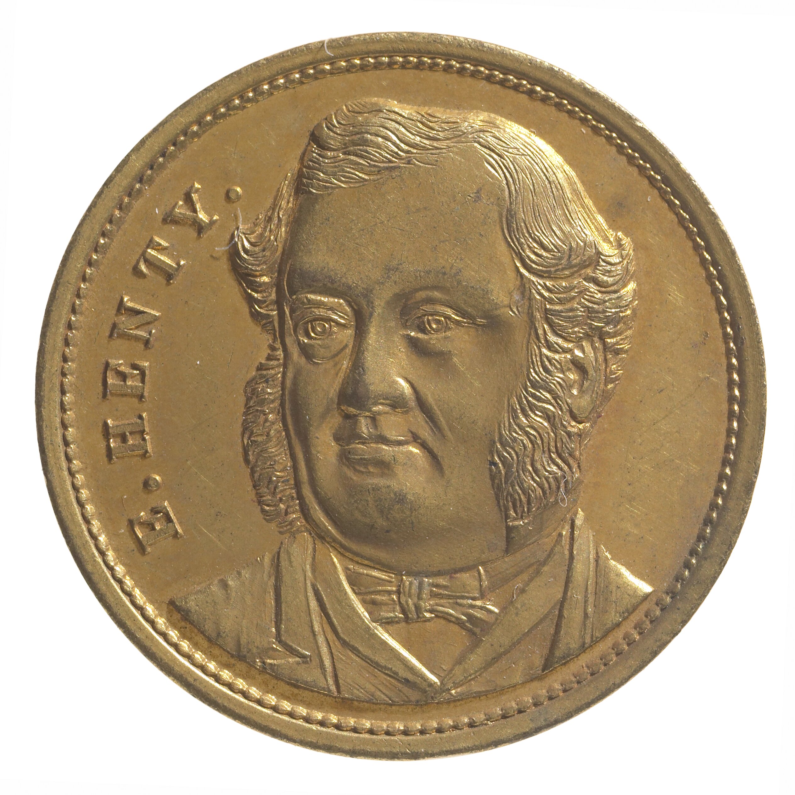 Medal issued to commemorate the 50th anniversary of Edward Henty's arrival in Portland, Victoria. Edward Henty was born in England in 1809 and migrated to Australia, as did his parents and brothers, in 1829. On 19 November 1834 he sailed from Launceston in the Hentys' own schooner, the Thistle, with stock and a small party. His brother Francis followed the next month with a small flock of merino sheep, the first in Victoria. The Henty brothers began whaling at Portland Bay and took their flocks and herds inland to the rich area on the Wannon River. In the 1840s they were eventually granted pre-emptive rights over most of their lands. Henty was known as a capable and energetic man and regarded as the chief actor in the early history of Portland Bay. He and his wife Anne Marie Gallie moved to Muntham, a 60,000-acre property that became widely known for its merino sheep and Durham cattle. It was also known for its extravagent hospitality - to which Henty's social ambition and vanity contributed considerably. This extravagence and Henty's obstinacy eventually led to the degredation of the flocks. Henty lived in Portland and in his Melbourne mansion, Offington, while he served as a member of the Victoria Legislative Assembly. He died on 14 August 1878.