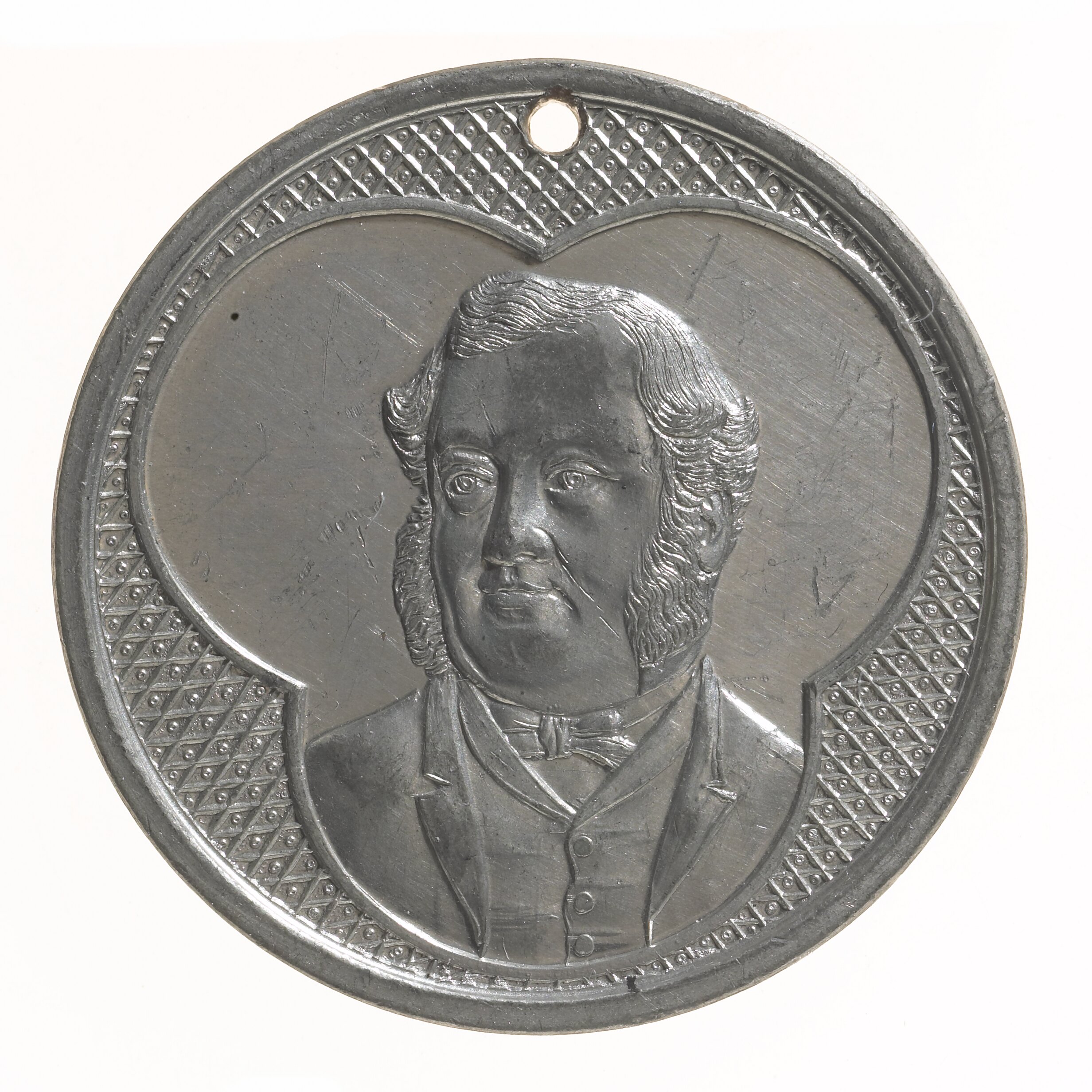 At centre within ornate trefoil compartment, bust of Edward Henty three-quarters left wearing suit and bow-tie