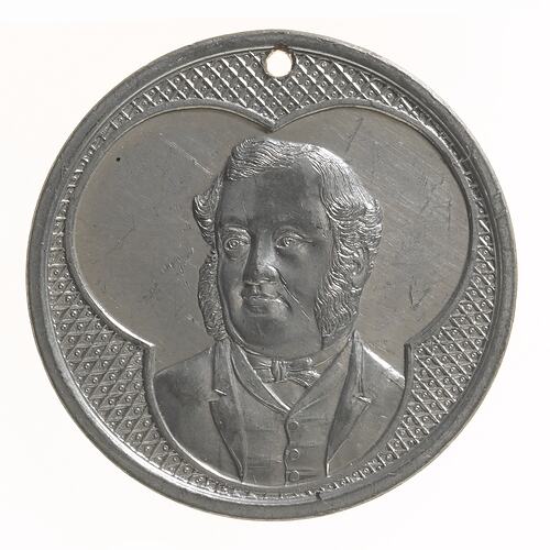 Medal issued to commemorate the 50th anniversary of Edward Henty's arrival in Portland, Victoria. Edward Henty was born in England in 1809 and migrated to Australia, as did his parents and brothers, in 1829. On 19 November 1834 he sailed from Launceston in the Hentys' own schooner, the Thistle, with stock and a small party. His brother Francis followed the next month with a small flock of merino sheep, the first in Victoria. The Henty brothers began whaling at Portland Bay and took their flocks and herds inland to the rich area on the Wannon River. In the 1840s they were eventually granted pre-emptive rights over most of their lands. Henty was known as a capable and energetic man and regarded as the chief actor in the early history of Portland Bay. He and his wife Anne Marie Gallie moved to Muntham, a 60,000-acre property that became widely known for its merino sheep and Durham cattle. It was also known for its extravagent hospitality - to which Henty's social ambition and vanity contributed considerably. This extravagence and Henty's obstinacy eventually led to the degredation of the flocks. Henty lived in Portland and in his Melbourne mansion, Offington, while he served as a member of the Victoria Legislative Assembly. He died on 14 August 1878.