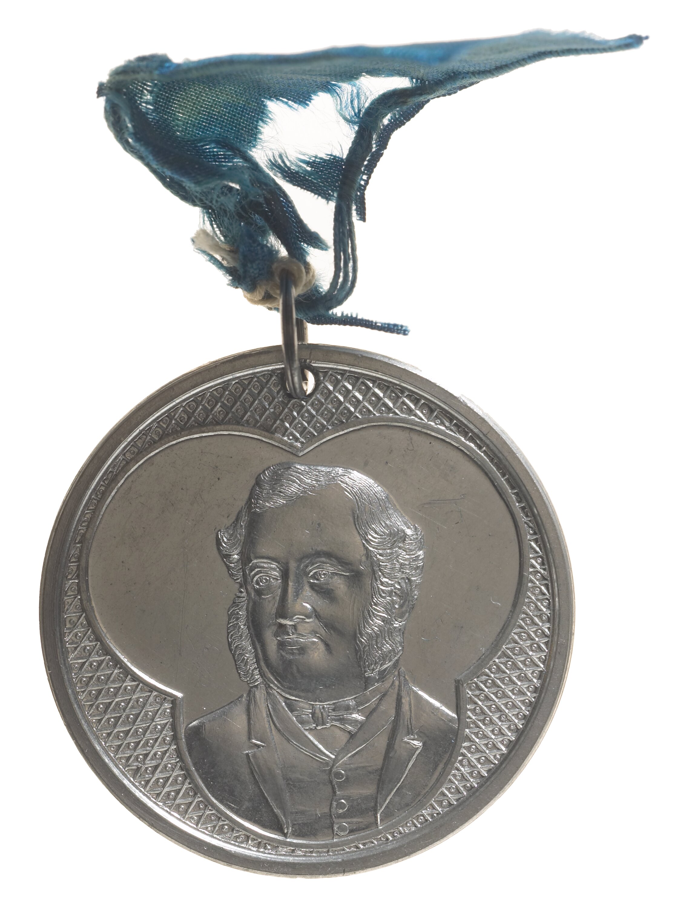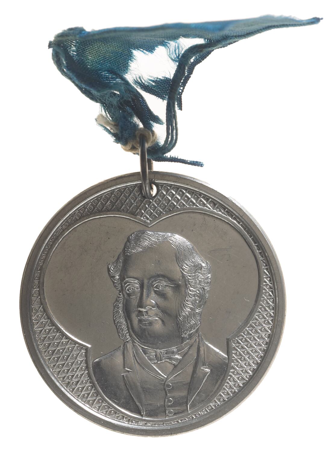 At centre within ornate trefoil compartment, bust of Edward Henty three-quarters left wearing suit and bow-tie Ring with original blue ribbon for wearing through hole at 12
