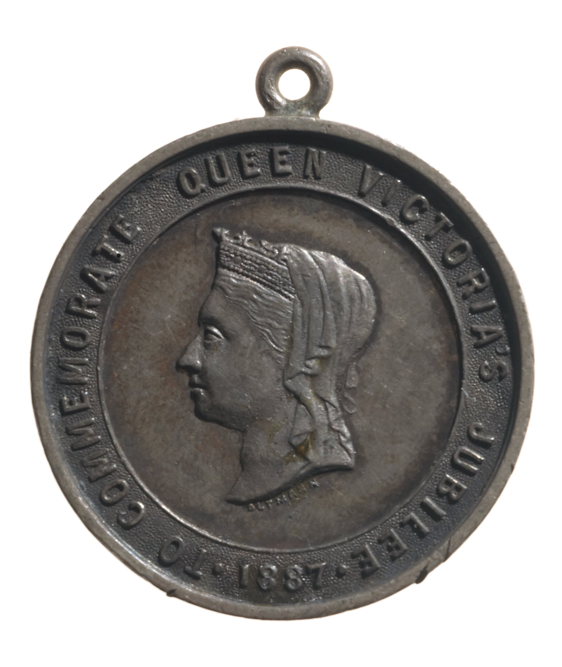 Within line circle, head of Queen Victoria, veiled and wearing coronet, BELOW THE ARTIST'S NAME, ALTMANN; around on broad rim, TO COMMEMORATE QUEEN VICTORIA'S JUBILEE . 1887 .