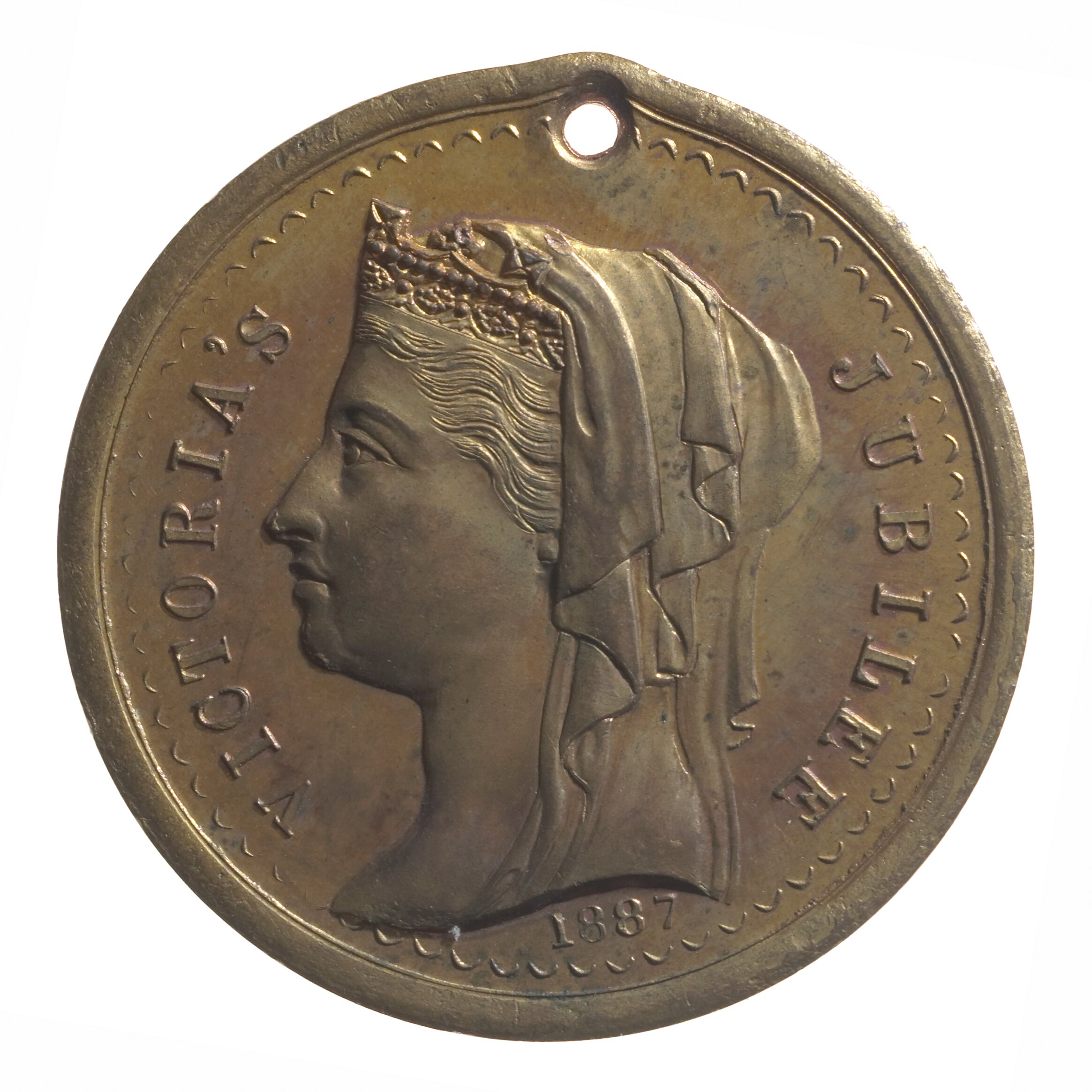 Head of Queen Victoria facing left, wearing veil and coronet; Around, VICTORIA'S JUBILEE Below, 1887. Inscription on truncation of Queen's neck: nil