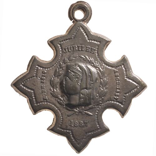 At centre within a wreath, head of Queen Victoria facing left, Veiled; on arms of cross, top, JUBILEE, bottom, 1887 left, BORN 1819; right, ASCD. 1837