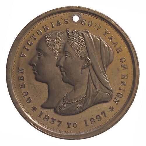 Conjoined head of Victoria of 1837 and veiled bust of Victoria of 1897; around, QUEEN VICTORIA'S 60TH. YEAR OF REIGN * 1837 TO 1897 *