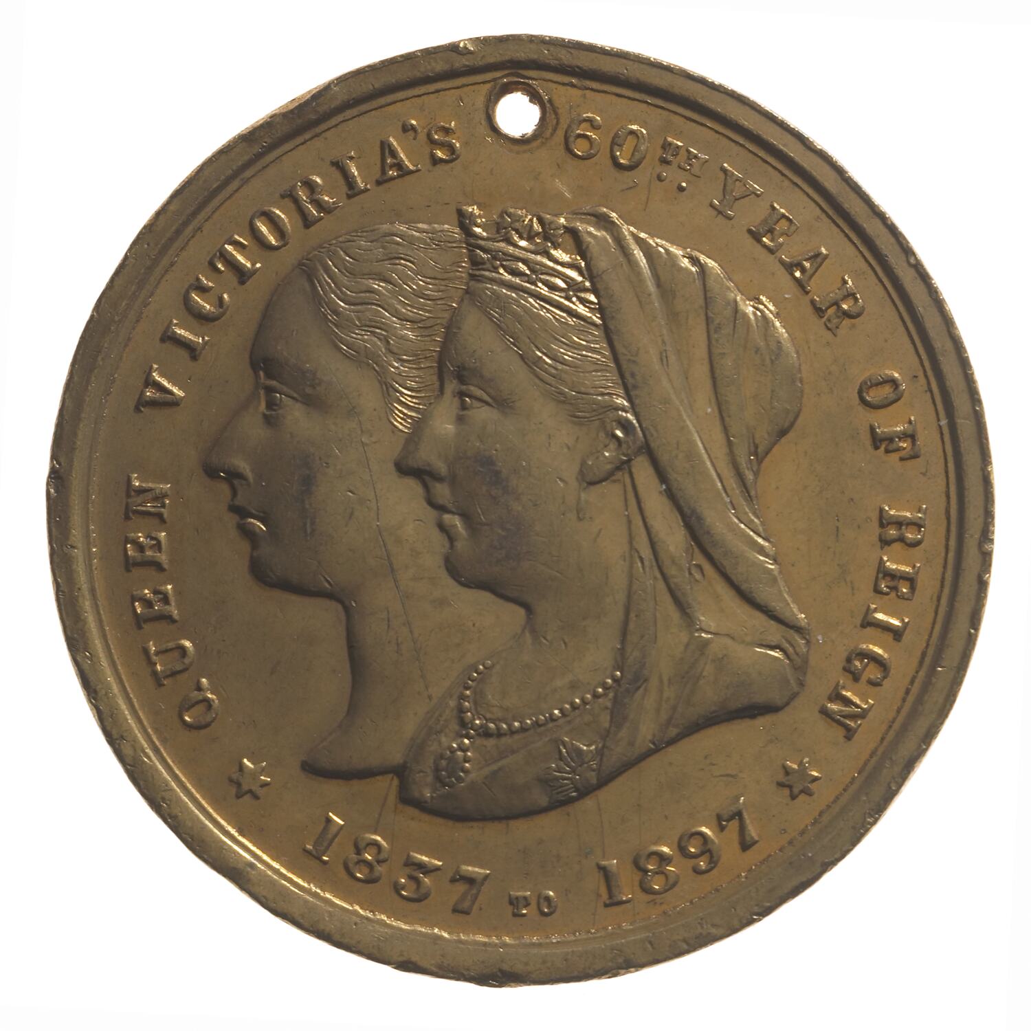 Conjoined head of Victoria of 1837 and veiled bust of Victoria of 1897; around, QUEEN VICTORIA'S 60TH. YEAR OF REIGN * 1837 TO 1897 *;