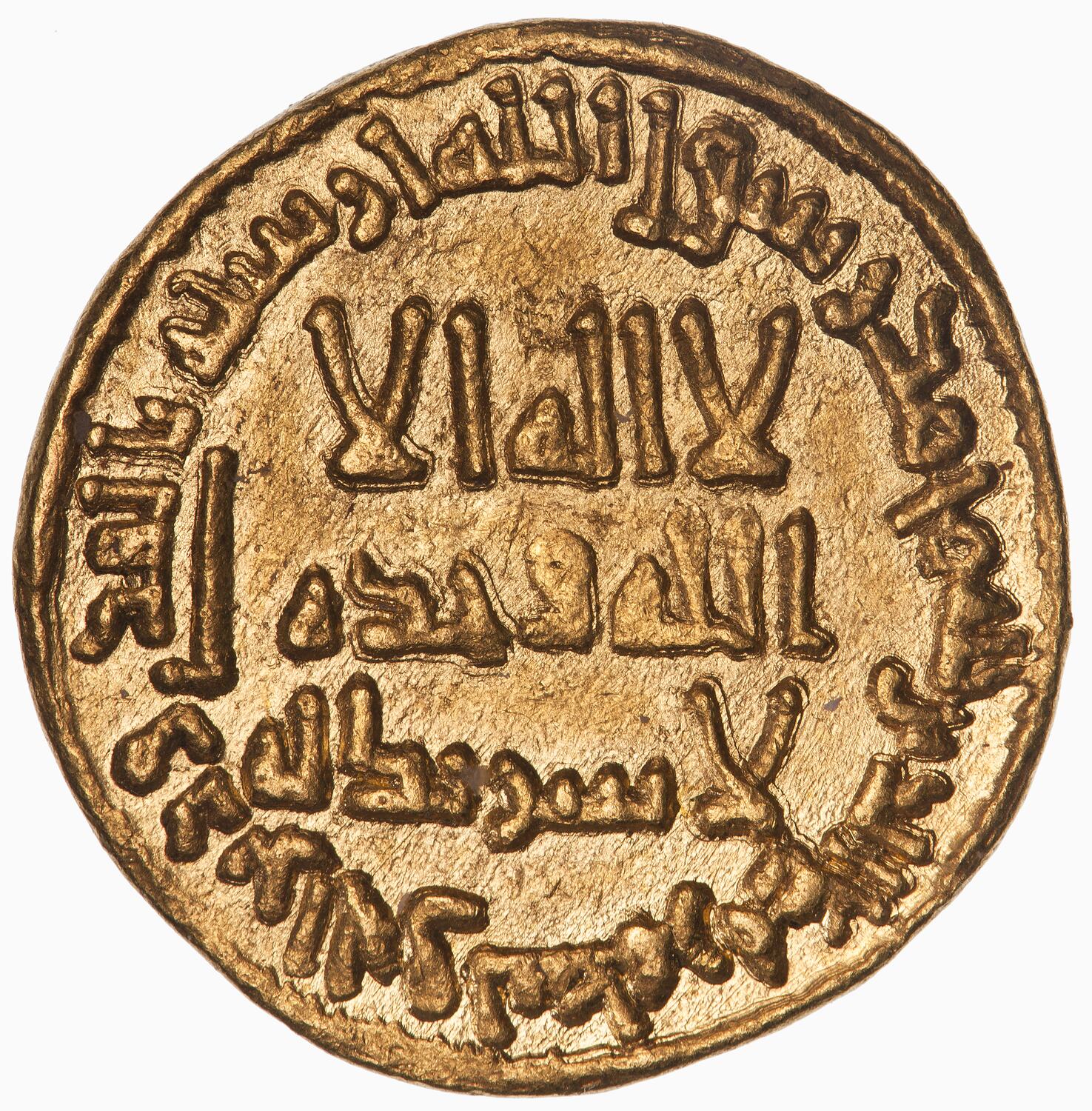 Dinar coin issued by the Umayyad Caliph Hisham (723-743 AD). Struck at the Damascus mint (probable) in the year 106 AH (724-725 AD). The coinage reform which led to the issue of this coin began in 77 AH (696-697 AD) under the Umayyad Caliph 'Abd al-Malik. It removed all symbolism associated with Byzantine or Sassanian rule. Instead a purely inscriptional coin-type, giving in Arabic ( script and language) the Muslim confession of faith, and various Qur'anic verses were employed. On gold coins the date is of production is provided but not the name of the mint, it is believed that Damascus was the sole gold mint.