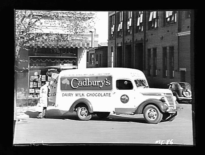 International D series motor delivery van marked 'Cadbury's Dairy Milk Chocolate' parked outside shop in Spring St, Melbourne. Victorian number plate.