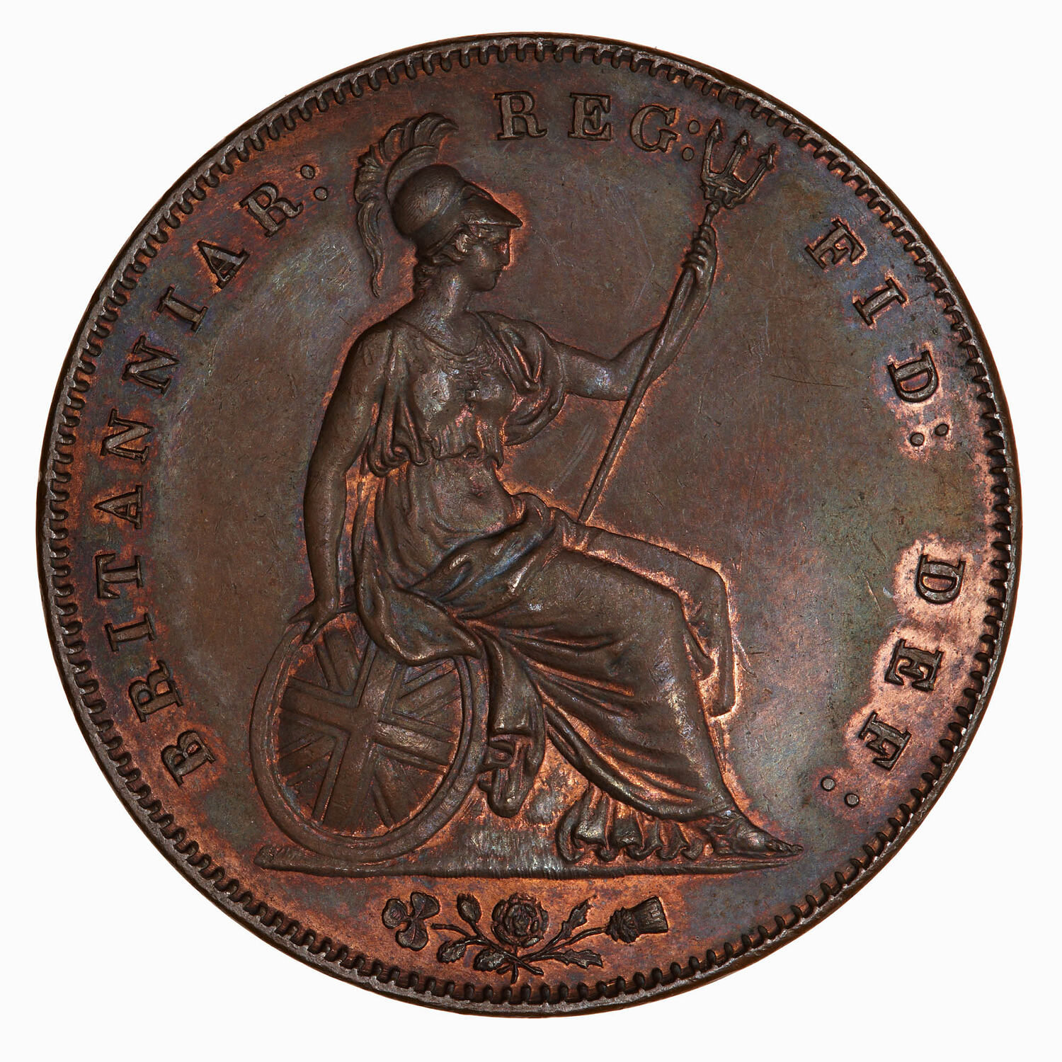 Britannia seated facing right holding trident and resting her right hand on a shield; around, BRITANNIAR: REG: FID: DEF:; in exergue, a rose, thistle and shamrock united.