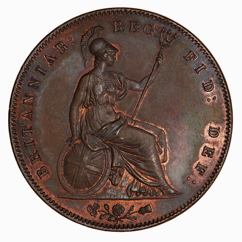 The circulation copper penny with Britannia on the reverse was struck for Queen Victoria between 1839 and 1859. It was discontinued in 1860 when it was replaced by a smaller bronze penny. This copper piece was struck in 1860, the last two figures of the date were altered on the die, the 60 is over 59. It was not intended for circulation.