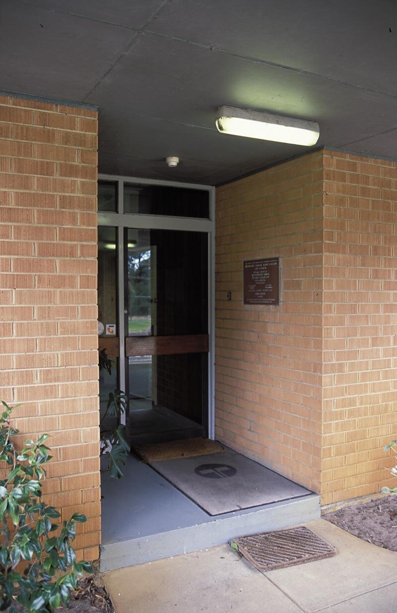 Photographic colour slide showing the main entrance door to the Melbourne Coastal Radio Station, Cape Schanck, Victoria. The plaque commemorating the opening of the building in 1966 is shown on the wall to the right of the door.