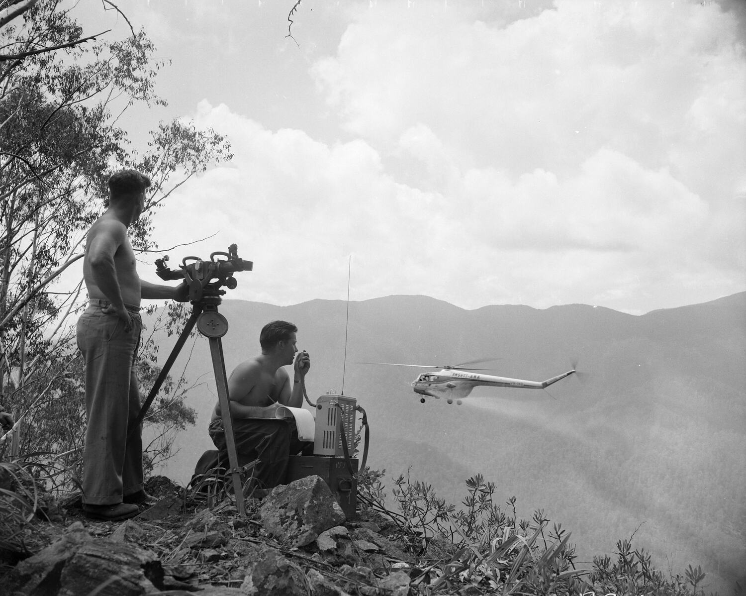 Black and white negative of two men with a tripod and hand radio watching a helicopter spraying in the Kiewa Valley, 1960-1961.