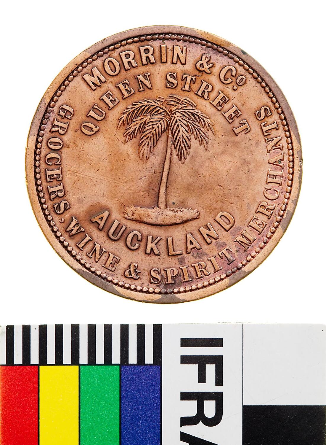 A round copper token (34 mm diameter). The token features the name, address and business of the issuer: Morrin & Co., Queen St. Auckland, grocers wine and spirit merchant, around a palm tree. The reverse features a female figure representing Justice standing facing left. She wears a blindfold and extends a balanced set of scales with her right hand. With her left she holds an inverted cornucopia from which fruits flow onto the ground. She wears an ancient-style of flowing dress bound at the waist, her left arm is draped to near the elbow while drapery falls from her extended arm to below the horizon line behind; around above, ADVANCE AUCKLAND. A Maori, holding a spear, and a gold prospector, holding a pick, shake hands at left of token below the scales. This token has been cleaned and varnished