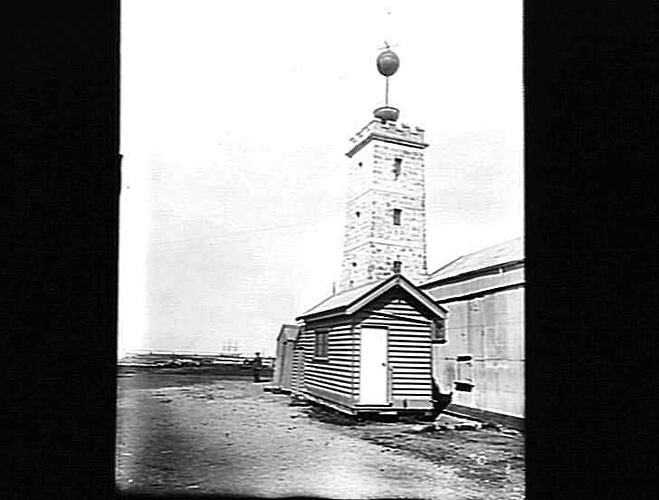 The timeball tower at Williamstown. A telegraph signal from Melbourne Observatory at precisely 1pm each day lowered the brass ball. This allowed ships in Hobson's Bay to correct their chronometers -- essential for safe navigation. The timeball was erected on this tower in 1861.