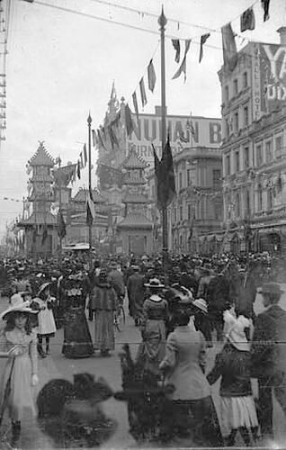 Crowds in Swanston Street, Federation Celebrations, Melbourne, May 1901. Most of the crowd are walking north up Swanston Street as is the Cable tram travelling underneath the Chinese Arch. It looks like the crowd is dispersing, going home after a parade. One man is on his bicycle. With few cars in existence, the Cable trams full, and most bicycles left at home, the only option would be to walk. A line of 'Venetian' poles line the parade route, between the poles are strung lines of bunting. The Chinese Arch was designed by a Western architect, George Austin, the arch reproduced pagoda architecture as depicted on the familiar willow-pattern plate. The arch, funded by the Chinese community, had tiers of red tiles and covered in splendidly coloured silks and adorned with hanging (unlit) lanterns and silk banners. At night a Chinese band playing traditional music played in the band room over the central arch. Musicians playing gongs accompanied them from the towers.