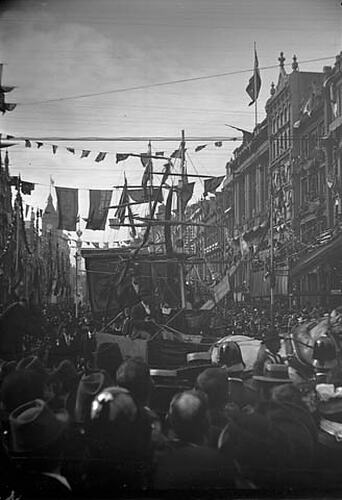 Glass negative stereograph showing a model of a ship taking part in the Trades Procession, Elizabeth Street, 11 May 1901. It is part of the G. H. Myers Collection which consists of 73 photographs taken by Godfrey Henry Myers, an electrician and amateur photographer, in Melbourne during May 1901. 72 of these photographs depict preparations for the celebrations that surrounded Federation; all but one are glass stereographs. This collection represents Myers' one venture into commercial photography. It is significant for its images of the crowds, which do not feature so prominently in commercial photographs. The remaining photograph is a family portrait.
