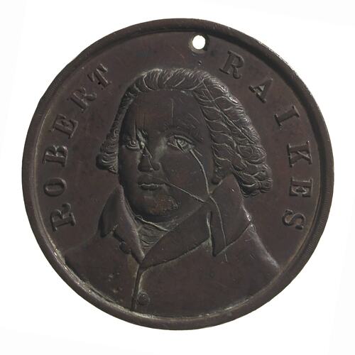 Bust of Robert Raikes facing 3/4 left; around, ROBERT RAIKES