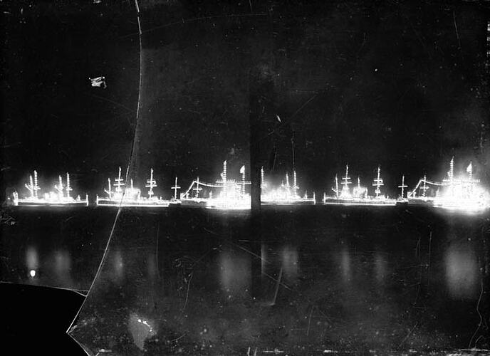 Glass negative stereograph showing Illuminated Ships anchored off Port Melbourne. It is part of the G. H. Myers Collection which consists of 73 photographs taken by Godfrey Henry Myers, an electrician and amateur photographer, in Melbourne during May 1901. 72 of these photographs depict preparations for the celebrations that surrounded Federation; all but one are glass stereographs. This collection represents Myers' one venture into commercial photography. It is significant for its images of the crowds, which do not feature so prominently in commercial photographs. The remaining photograph is a family portrait.