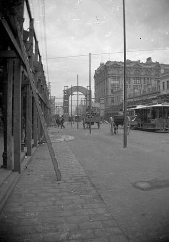 Federation celebration preparations in Swanston Street, Melbourne, April 1901. On the left a ladder leads to the temporary viewing stands constructed over the shop verandahs. On the right going past to North Carlton is a Cable tram with its Saloon and open Dummy car. A horse and gig and a cart carrying drainage pipes are travelling towards the wooden skeleton of what will become the temporary King's Arch.