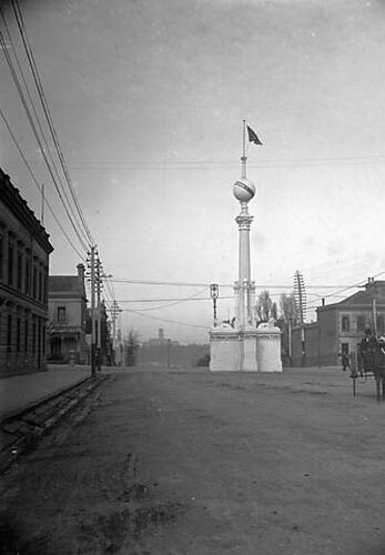 Glass negative stereograph showing the Chamber of Commerce Column, built on the corner of Collins and Exhibition streets It is part of the G. H. Myers Collection which consists of 73 photographs taken by Godfrey Henry Myers, an electrician and amateur photographer, in Melbourne during May 1901. 72 of these photographs depict preparations for the celebrations that surrounded Federation; all but one are glass stereographs. This collection represents Myers' one venture into commercial photography. It is significant for its images of the crowds, which do not feature so prominently in commercial photographs. The remaining photograph is a family portrait.