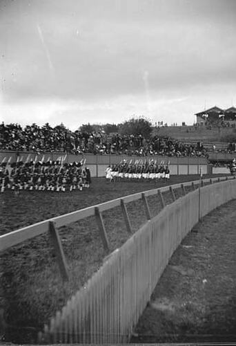 Glass negative stereograph showing the Fiji Armed Native Constabulary and the New Zealand Scottish Regiment participating in the Flemington Military Review. It is part of the G. H. Myers Collection which consists of 73 photographs taken by Godfrey Henry Myers, an electrician and amateur photographer, in Melbourne during May 1901. 72 of these photographs depict preparations for the celebrations that surrounded Federation; all but one are glass stereographs. This collection represents Myers' one venture into commercial photography. It is significant for its images of the crowds, which do not feature so prominently in commercial photographs. The remaining photograph is a family portrait.