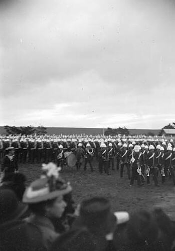 The Royal Marines and their band wearing their distinctive tall white helmets at the Flemington Military Review, Federation celebrations, Melbourne, May 1901. The band was from the Royal Yacht Ophir, and the Marines from the Ophir and the war cruisers Juno and St George.