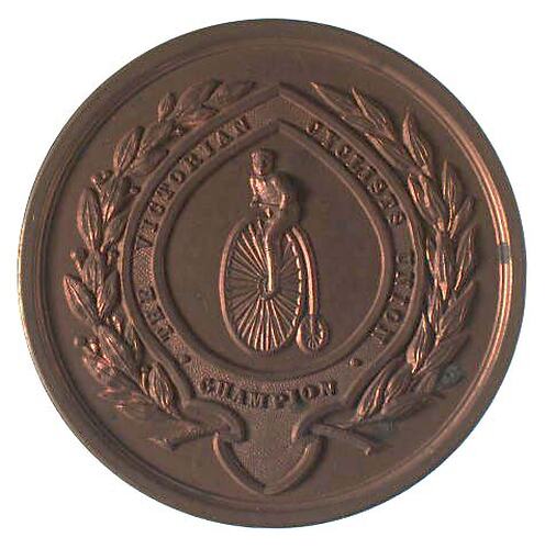 Other Details: Victorian Cyclists' Union Champion Prize medal, minted around 1900. The cycle racing craze of the 1890s saw the replacement of the penny-farthing as the racing cycle of choice by cycles of a more modern appearance. In 1891 the Exhibition Buildings constructed the colonies main cycle racing track where the entrance foyer of Museum Victoria now stands. The governing body of the sport was at that time the League of Victorian Wheelmen.
