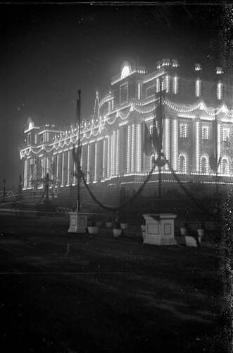 Glass negative stereograph showing an illuminated Parliament House. It is part of the G. H. Myers Collection which consists of 73 photographs taken by Godfrey Henry Myers, an electrician and amateur photographer, in Melbourne during May 1901. 72 of these photographs depict preparations for the celebrations that surrounded Federation; all but one are glass stereographs. This collection represents Myers' one venture into commercial photography. It is significant for its images of the crowds, which do not feature so prominently in commercial photographs. The remaining photograph is a family portrait.
