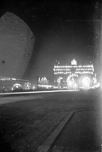 Illuminated Municipal Arch, Princes Bridge, Federation Celebrations, Melbourne, May 1901. This night time photograph necessitated a long exposure. Despite being taken with the aid of a tripod the image is a multiple exposure. This illuminated Battlement, with its flags flying, put the photographer in mind of Windsor Castle.