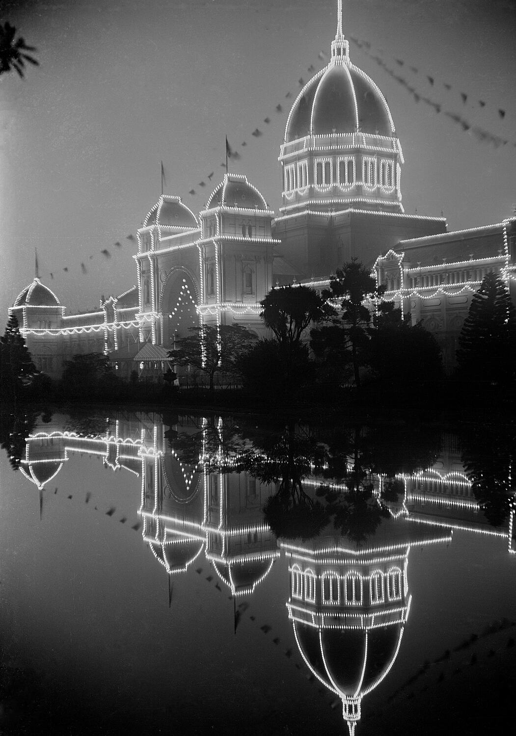 Illuminated Exhibition Building, Carlton, Federation Celebrations, Melbourne, May 1901. Ten thousand lights outlined the Exhibition Building. The upper lights were white, and the lower lights ruby red. They are reflected in the ornamental lake which once graced the front of the building. The building was the setting for the proclamation of Australia's first Parliament on the 9 May 1901. Melbourne remained the temporary Capital of the Commonwealth for 26 years until a Parliament House was built in Canberra.