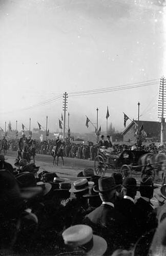 Glass negative stereograph showing the Duke and Duchess of York returning to Government House after opening the first Australian Parliament, 9 May 1901. It is part of the G. H. Myers Collection which consists of 73 photographs taken by Godfrey Henry Myers, an electrician and amateur photographer, in Melbourne during May 1901. 72 of these photographs depict preparations for the celebrations that surrounded Federation; all but one are glass stereographs. This collection represents Myers' one venture into commercial photography. It is significant for its images of the crowds, which do not feature so prominently in commercial photographs. The remaining photograph is a family portrait.