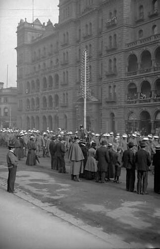 NSW Bushmen, Federation Celebrations, Spring Street, Melbourne, May 1901. The Bushmen are returning from an event so they are ambling along, teenage boys walk amongst them. They are walking past the Grand Coffee Palace, once known as the Grand Hotel (later to be known as the Windsor Hotel). Being a cool day with the possibility of rain, some women wear capes with collars up, one carries an umbrella. The helmeted police are also wearing their wet weather capes.