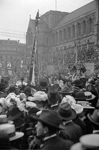 Chinese Procession, Federation Celebrations, corner Swanston and Flinders Streets, Melbourne 7 May 1901. The Chinese community staged their own procession which was viewed by an estimated 200,000 people. It involved hundreds of participants, a heavenly army, their wives and daughters, and two benevolent dragons. Silk banners were carried and silks of scarlet, rose pink, gold, blue, purple and yellow were worn. Two elaborately costumed young girls can be seen on horseback. In the background is St Paul's Cathedral. Stands for spectators were built in front of the cathedral by speculators. In these crowds, the most the non-paying crowd saw were other people's hats; especially if you stood behind men wearing top hats.