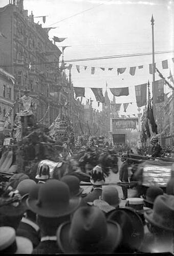 The opening of the Australian Parliament on May 9 1901 was an occasion for great celebrations in Melbourne. Ten days of festivities (from 6-16 May) were planned to mark the Federation of the new nation and honour the Royal visitors, the Duke and Duchess of Cornwall and York. The city was transformed with decorations - flags, bunting, colourful lights and festive arches - and a series of public events were held, including a military tattoo and several street parades. Unprecedented numbers of people arrived in Melbourne from the rest of Victoria and throughout Australia to take part in the celebrations.