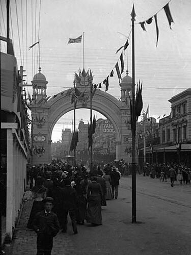 Glass negative stereograph showing the Citizen's Arch spanning Bourke Street. It is part of the G. H. Myers Collection which consists of 73 photographs taken by Godfrey Henry Myers, an electrician and amateur photographer, in Melbourne during May 1901. 72 of these photographs depict preparations for the celebrations that surrounded Federation; all but one are glass stereographs. This collection represents Myers' one venture into commercial photography. It is significant for its images of the crowds, which do not feature so prominently in commercial photographs. The remaining photograph is a family portrait.