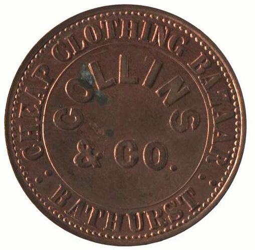Obverse: COLLINS & CO. CHEAP CLOTHING BAZAAR : BATHURST : Reverse: NEW SOUTH WALES 1864 T.STOKES MELBOURNE