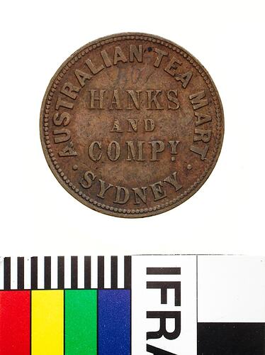 A round copper token (28 mm dia) featuring the name and business of the issuer: Hanks and Co., Australian Tea Mart Sydney The reverse features an Arms of New South Wales supported by a kangaroo and emu.