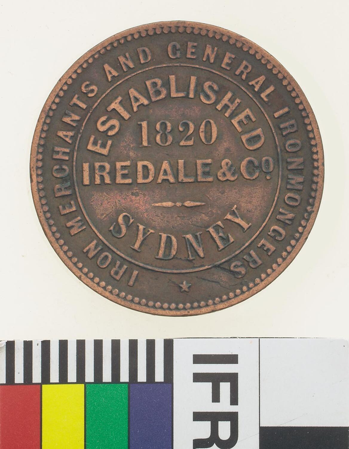 A round copper token (34 mm diameter). The token design featuring the name, partial address, business and foundation date of the issuer: Iredale and Co., Sydney, iron merchants and general ironmongers. The reverse depicts Justice standing facing left, blindfolded and extending balanced scales from her right hand, her left hand rests on an inverted cornucopiae from which fruits flow. A sailing ship is seen on the horizon to the left of the figure. This token has been lightly cleaned, the reverse has re-toned green.