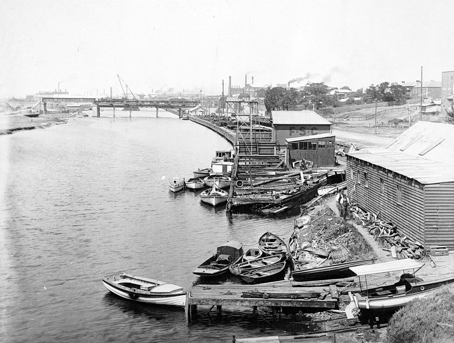 This image shows wharves, a bridge, a crane, boats, jetties, various industrial buildings and tall chimneys, along the Maribyrnong River in Footscray. At front right are the boat sheds belonging to Alfred Sims. Behind this, the building with the initials 'F.S.C.' is the Footscray Swimming Club rooms which operated 1909 to 1930. Their diving tower is visible to the left of the club rooms. The multi-story buildings with the tall chimneys in the far background near the river on the right are the Barnett Glass Rubber Works, which operated at this site until 1939.