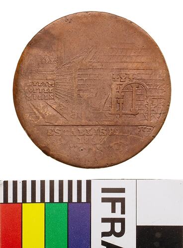 A round copper token (34 mm diameter). The token design featuring the business and foundation date of the issuer: Tea Stores Steam Coffee Mill. It features a view of teas store and shop; on building at left background in five lines; TEA / STORES / STEAM / COFFEE / MILLS in exergue, ESTABLISHED / 1835 / SYDNEY. On the reverse is Britannia seated facing right wearing Corinthial helmet and holding a trident in her left hand, shield with Union Jack resting behind. Above, BRITANNIA; in exergue, 1853 (poorly struck and difficult to read) and, in small letters below shield, JCT.This token has been cleaned and laquered.