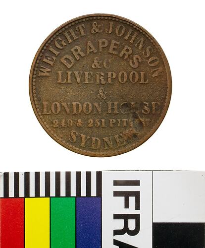 A round copper token (28 mm diameter). The token design featuring the name, business and address of the issuer: Weight & Johnson, drapers and outfitters, Liverpool and London House, Pitt St. Sydney. It features a representation of Justice standing blindfolded holding scales and an inverted cornucopiae spilling fruit on the ground. A sailing ship is on the horizon. This token is covered in fine pitting and is damagedby heavy knocks around the end of the word PITT and on the adjacent reverse.