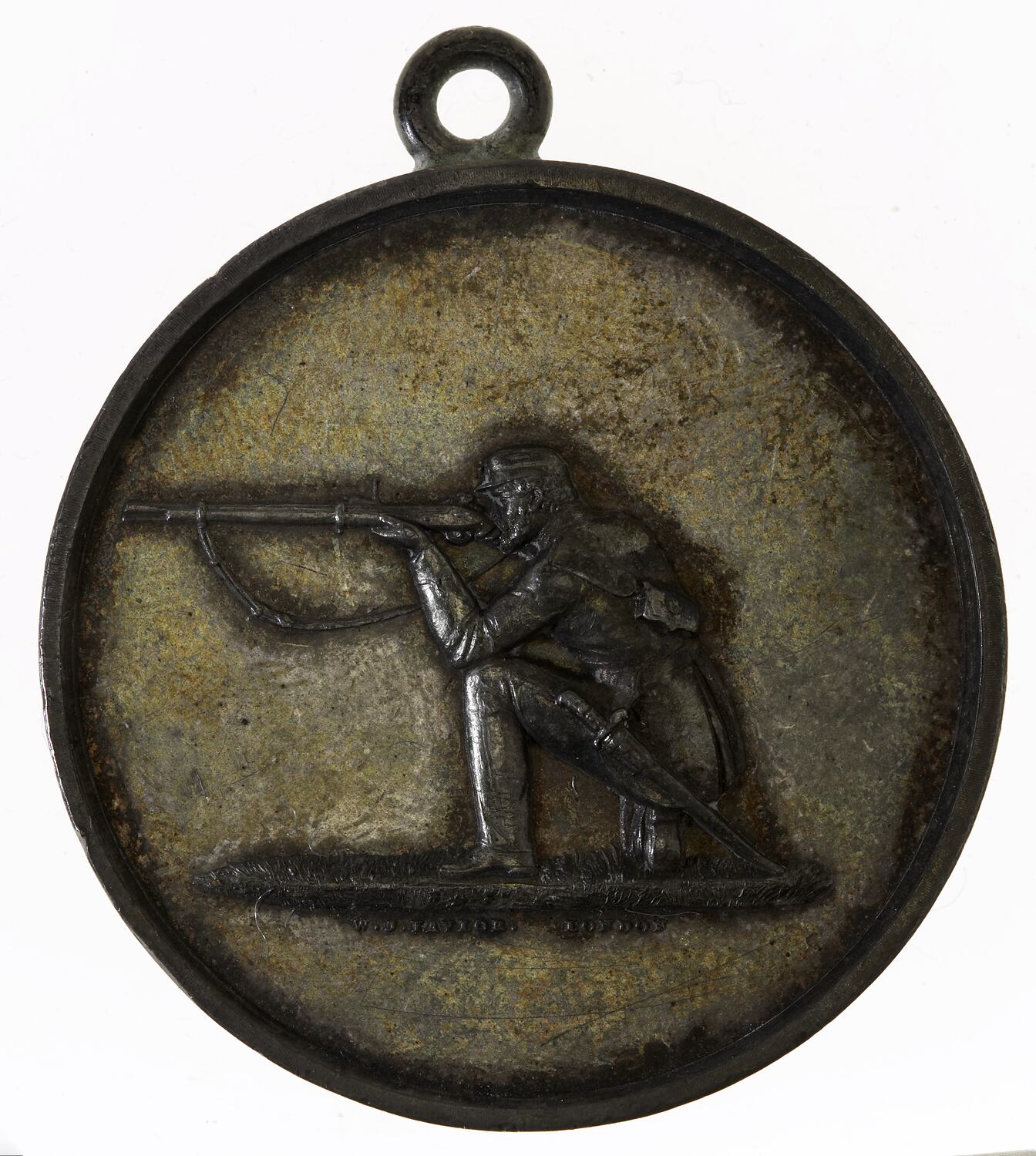 Rifleman taking aim, kneeling & facing left below in small letters the makers name; W.J. TAYLOR. LONDON