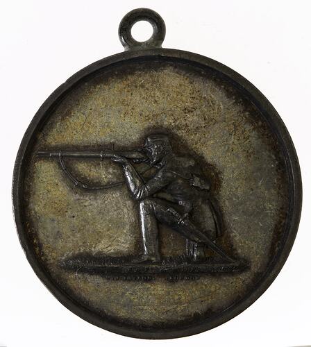 A silver prize medal (38 mm diameter) with loop attached to edge at top, featuring rifleman kneeling taking aim.